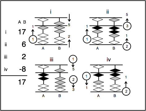In this first example we start by adding 17 to the abacus adding 1 to 0 on rod A and 7 to 0 on rod B. Next we add 6 to 17 by adding 6 to 7 on rod B. Notice this addition will require using the 5/10 pair combination. First doing the 10 pair addition we add 1 to 1 on rod A and then subtract 4, the 10 pair complement of 6, from 7 on rod B. But since there are only 2 lower beads touching the bar we will need to subtract the 4 as a 5 pair. So subtract the 4 by adding 1, the 5 pair complement of 4, and subtract the 5 bead. The interim sum is now 23. Next add 2 to 23 by adding 2 to 3 on rod B using the 5 pair addition. Add 5 and subtract 2, the 5 pair complement of 3, on rod B for an interim sum of 25. Lastly subtract 8 from 25 by subtracting 8 from 5 on rod B using the 10 pair subtraction rule. First subtract 1 from 2 on rod A and then add 2, the 10 pair complement of 8, to 5 on rod B. The final answer is 17.