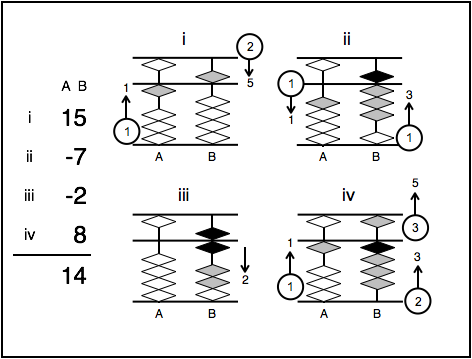 Let’s look at the example problem 7 + 7. To add the second 7 to the first we use the 10 pair addition rule. So first add 1 to the next rod left and then subtract 3, the 10 pair complement of 7, from 7 on the target rod. However to subtract 3 from 7 we need to use the 5 pair subtraction rule since we only have 2 lower earthly beads touching the reckoning bar. Therefore to subtract the 10 pair complement 3, in the form of a 5 pair we add 2 earthly beads, 3’s five pair complement, and subtract the 5 bead leaving the answer of 14.
