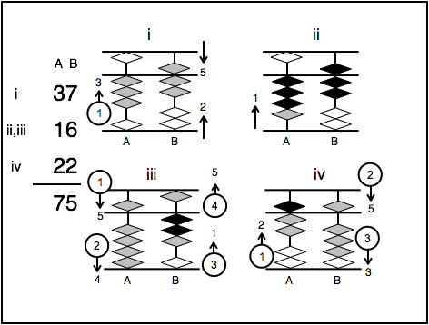 In this first example we start off by adding 37 to the abacus adding 3 to rod A and 7 to rod B. Next we add 16 to 37 on the abacus. We will take a digit by digit approach working from left to right. Abacus users work problems from left to right instead of how we are traditionally taught working right to left. It is much more efficient to work from left to right because this is how we read numbers. It is also working from the most significant digit in each number to the least significant digit. Working left to right we start adding 16 to 37 by adding 1 to 3 on rod A. The interim sum is now 47. Next we add the 6 to 7 on rod B using the 10 pair addition rule. However this 10 pair addition will require the Forward Double Five. According to the 10 pair addition rule we first add 1 to 4 on rod A using a 5 pair movement by adding 5 and subtracting 4, the 5 pair complement of 1, on rod A leaving 5 on rod A. We complete the 10 pair addition by subtracting 4, the 10 pair complement of 6, from 7 on rod B again using a second 5 pair. We add 1, the 5 pair complement of 4, and subtract 5 leaving 3 on rod A. The interim sum is now 53 completing the Forward Double Five movement. Lastly we add 22 to 53 by first adding 2 to 5 on rod A leaving 7 on rod A. Then we add 2 to 3 on rod B using a 5 pair by adding 5 and subtracting 3, the 5 pair of 2, leaving 5 on rod B. The final answer is 75.