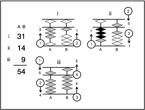 In this second example of Forward Double Fives we start by adding 31 to the abacus adding 3 to 0 on rod A and 1 to 0 on rod B. Next we add 14 to 31 by first adding 1 to 3 on rod A. Then add 4 to 1 on rod B using a 5 pair adding 5 and subtracting 1, the 5 pair complement of 4, leaving 5 on rod B. The interim sum is now 45. Lastly we add 9 to 45 by adding 9 to 5 on rod B. This will require the Forward Double Five bead movement. We add 9 to 5 using the 10 pair addition rule first adding 1 to 4 on rod A. Add 1 to 4 using a 5 pair adding 5 and subtracting 4, the 5 pair complement of 1, leaving 5 on rod A. Next we subtract 1, the 10 pair complement of 9, from 5 on rod B again using a 5 pair. Add 4, the 5 pair complement of 1, and subtract 5 leaving 4 on rod B. The final answer is 54.
