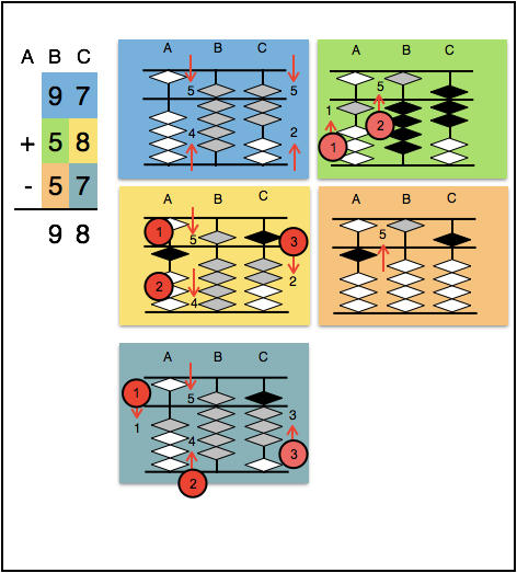 In the first example we start by adding 97 to the abacus. Next we add 58 to 97 by first adding 5 to 9 on rod B using a 10 pair addition by adding 1 to 0 on rod A and subtracting 5, the 10 pair complement of 5, from 9 on rod B. We add 8 to 7 on rod C using a 10 pair addition by adding 1 to 4 on rod B using a 5 pair adding 5 and subtracting 4 leaving 5 on rod B. Next we subtract 2, the 10 pair complement of 8, from 7 on rod C for an interim sum of 155. Next we subtract 57 from 155 by first subtracting 5 from 5 on rod B leaving 0 on rod B. Then we subtract 7 from 5 on rod C using a 10 pair subtraction. First subtract 1 from 0 on rod B by doing another 10 pair subtraction and subtracting 1 from 1 on rod A and adding 9, the 10 pair complement of 1, to 0 on rod B. Finish the movement by adding 3, the 10 pair complement of 7, to 5 on rod C for a final answer of 98.