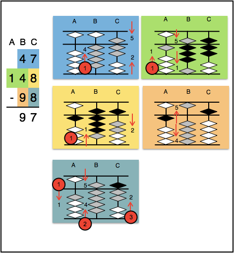 In the last example we start by adding 47 to the abacus. Next we add 148 to 47 by first adding 1 to 0 on rod C. Then adding 4 to 4 on rod B using a 5 pair by adding 5 and subtracting 1 leaving 8 on rod B. Next we add 8 to 7 on rod C using a 10 pair addition by adding 1 to 8 on rod B and then subtracting 2, the 10 pair of 8, from 7 on rod C for an interim sum of 195. Lastly we subtract 98 from 195 by first subtracting 9 from 9 on rod B leaving 0 on rod B. Next we subtract 8 from 5 on rod C using a 10 pair subtraction by subtracting 1 from 0 on rod B. To subtract 1 from 0 on rod B we use another 10 pair subtraction by subtracting 1 from 1 on rod A and adding 9, the 10 pair complement of 1, to 0 on rod B. Finally we add 2, the 10 pair complement of 8, to 5 on rod C for a final answer of 97.