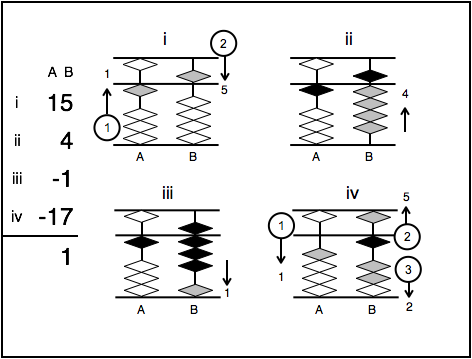 Example #1: In this example we start by adding the number 15 to the abacus. First add 1 lower bead with the thumb on rod A and the upper 5 bead with the index finger on rod B. Next add 4 to 15 by adding 4 lower beads with the thumb on rod B. The interim sum on the abacus is now 19. Next subtract 1 from 19 by moving 1 lower bead with the index finger away from the bar on rod B. The interim sum is now 18. Lastly subtract 17 from 18 by firstly subtracting 1 from 1 on rod A. Next subtract 7 from 8 on rod B by removing the upper 5 bead and 2 lower beads with the index finger on rod B. The final sum is 1.