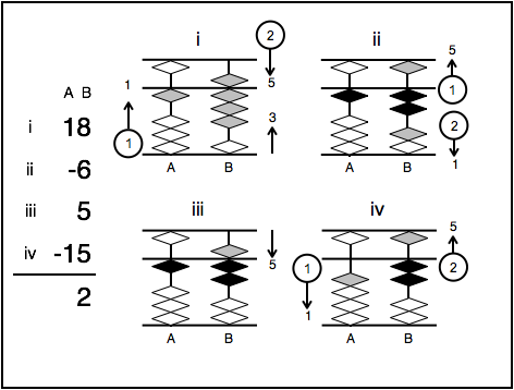 Example #3: In this example we start by adding 18 to the abacus. First add 1 to rod A by adding 1 lower bead. Then add 8 to rod B by pinching the upper 5 bead with 3 lower beads. Next subtract 6 from 18 on the abacus by first moving the upper 5 bead with the index finger away from the bar on rod B. Then move 1 lower bead with the index finger away from the bar on rod B. The interim sum is now 12. Add 5 to 12 by moving the upper 5 bead with the index finger on rod B to the bar. The interim sum is now 17 on the abacus. Finally, subtract 15 from 17 on the abacus by first subtracting 1 from 1 on rod A. Then subtract 5 from 7 on rod B by moving the upper 5 bead with the index finger away from the bar. The final sum on the abacus is 2.