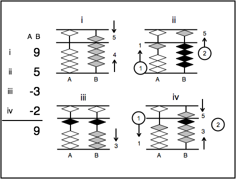 In the first example we start by adding 9 to the abacus. Next we add 5 to 9 but notice that we will need to use the 10 pair addition rule. So first add 1 to the next rod left, rod A, and then subtract 5, the 10 pair complement of 5, from 9 on rod B. The interim sum is now 14. Next subtract 3 from 4 on rod B for an interim sum of 11. Lastly subtract 2 from 11 by subtracting 2 from 1 on rod B. But since there are not enough beads touching the reckoning bar we will need to use the 10 pair subtraction rule. So first subtract 1 from the next rod left, rod A, and then add 8, the 10 pair complement of 2, to 1 on rod B for a final answer of 9.