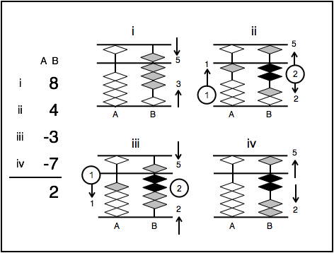 In the next example we start by adding 8 to the abacus. Next we add 4 to 8 using the 10 pair addition rule. So first add 1 to the next rod left, rod A, and then subtract 6, the 10 pair complement of 4, from 8 on rod B. The interim sum is now 12. Next subtract 3 from 12 by subtracting 3 from 2 on rod B. Again we will need to use the 10 pair subtraction rule. First subtract 1 from the next rod left, rod A, and then add 7, the 10 pair complement of 3, to 2 on rod B. The interim sum is now 9. Finally subtract 7 from 9 on rod B for a final answer of 2.