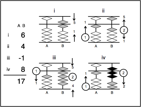 In the last example we start by adding 6 to the abacus. Next add 4 to 6 using the 10 pair addition rule. So first add 1 to the next rod left, rod A, and then subtract 6, the 10 pair complement of 4, from 6 on rod B. The interim sum is now 10. Next subtract 1 from 10 by subtracting 1 from 0 on rod B. Again we will need to use the 10 pair subtraction rule. First subtract 1 from 1 on the next rod left, rod A, and add 9, the 10 pair complement of 1, to 0 on rod B. The interim sum is now 9. Lastly add 8 to 9 on rod B by using the 10 pair addition rule. First add 1 to 0 on next rod left, rod A, and subtract 2, the 10 pair complement of 8, from 9 on rod B. The final answer is 17.