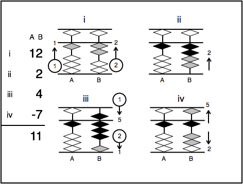 In the first example we start by adding 12 to the abacus placing 1 on rod A and placing 2 on rod B. Next we add 2 to 12 by adding 2 to 2 on rod B for an interim sum of 14. Then we add 4 to 14 by adding 4 to 4 on rod B. But here we notice there are no available lower beads to add 4. But there is the upper 5 bead available. So to add 4 to 4, we first add 5 pulling the upper bead to the bar and then subtract 1, the 5 pair complement of 4, from the lower 4 beads. So in effect we have added 5 but subtracted 1 so the net addition is 4. The interim sum is now 18. We show the 5 pair finger movements as two separate finger movements but they can be combined and both beads moved at the same time. Lastly we subtract 7 from 18 by subtracting 7 from 8 on rod B for a final answer of 11.