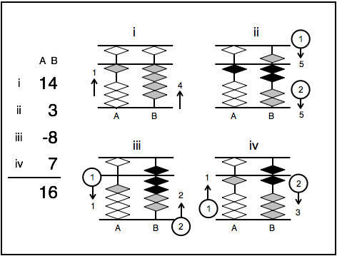 In this next example we start by adding 14 to the abacus first adding 1 to rod A and then 4 to rod B. Next we add 3 to 14 by adding 3 to 4 on rod B. Since there are no available lower beads we will have to use the 5 pair complement addition. So first add 5 on rod B and then subtract 2, the 5 pair complement of 3, from the 4 lower beads. The interim sum is now 17. Next subtract 8 from 17 by subtracting 8 from 7 on rod B. Here we will need the 10 pair subtraction rule. So first subtract 1 from 1 on rod A and then add 2, the 10 pair complement of 8, to 2 on rod B for an interim sum of 9. Lastly add 7 to 9 on rod B using the 10 pair addition rule. First add 1 to 0 on rod A and then subtract 3, the 10 pair complement of 7, from 9 on rod B. The final answer is 16.