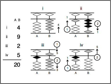 In the last example we start by adding 4 to the abacus on rod B. Next add 9 to 4 on rod B by using the 10 pair addition rule. First add 1 to 0 on rod A then subtract 1, the 10 pair complement of 9, from 4 on rod B for an interim sum of 13. Next add 2 to 13 by adding 2 to 3 on rod B. Here we will need the 5 pair addition rule. So first add 5 and then subtract 3, the 5 pair complement of 2, from 3 on rod B. The interim sum is now 15. Lastly add 5 to 15 by adding 5 to 5 on rod B using the 10 pair addition rule. So first add 1 to 1 on rod A and then subtract 5, the 10 pair complement of 5, from 5 on rod B. The final answer is 20.