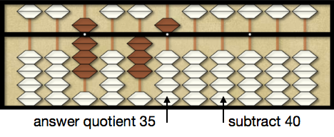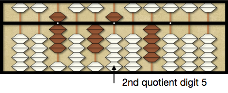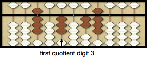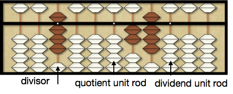 Note: the following examples will place the divisor on the abacus for reference but this is not necessary and is a matter of preference. More advance abacus users will usually not place the divisor on the abacus to save time.