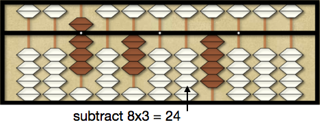Now we subtract 8×3 = 24 from 28 on the dividend by first subtracting 2 from 2 on the third rod and subtracting 4 from 8 using a 5 pair on the second rod leaving 40 on the dividend.