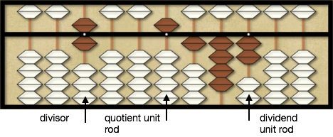 First we need to setup our division problem on the abacus. We will show the divisor for clarity but typically we would not take the time to place the divisor on the abacus. You will notice that we chose a quotient unit rod that coincides with the first digit of the dividend. Choosing this quotient unit rod is not a problem since after the first subtraction we will remove the first dividend digit. If we can, by convention we place the quotient on 4 rods between the divisor and dividend. For larger quotient answers we will not place the divisor on the abacus to provide more calculating space.