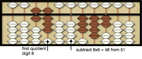 To begin our abacus math division we compare the divisor 6 with the first dividend digit 5. Since 6 is larger than 5 we will compare the divisor 6 with the first two dividend digits 51. Since we moved 1 rod to the right on the dividend will also move 1 rod right on the quotient to the 3rd quotient rod. Because 6×8 = 48 (and 6×9 = 54 which is larger than 51) we will place 8 as the first quotient digit on the 3rd rod and subtracting 48 from 51 on the dividend leaving 342 on the dividend.
