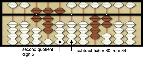 Moving one more rod to the right on the dividend we compare the divisor 6 to 34 on the dividend. Since 6×5 = 30 we place 5 as the second quotient digit and subtract 30 from 34 on the dividend leaving 42 remaining on the dividend.