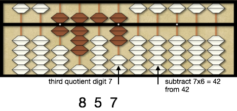 Again moving one more rod right on the dividend we compare the divisor 6 with 42 remaining on the dividend. Since 6×7 = 42, we place 7 as the 3rd quotient digit on the quotient unit rod and subtract 42 from 42 on the dividend. Since we have zeroed out the dividend our final answer is 857.