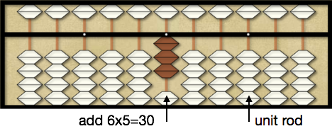 We first determine the starting rod location to begin entering our first product. Since the number of multiplicand digits is 2 and the number of multiplier digits is 2, our starting rod is 4 rods to the left of the chosen unit rod. Including our chosen unit rod we count 4 rods to the left and enter the first product by multiplying the 5 of 52 by the 6 of 63, 5×6 = 30. Enter 63 on the abacus on the 4th rod.