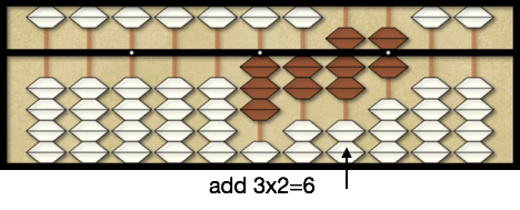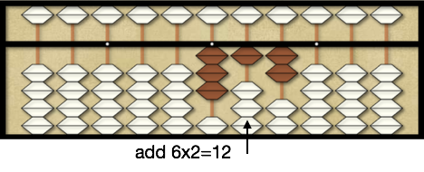 Next we multiply the 2 of 52 by the 6 of 63, 2×6=12. Since we moved one digit to the right in the multiplicand we also move one rod to the right on the abacus to the 3rd rod. Add the product of 6×2 = 12 on the 3rd rod from the unit rod on the abacus.