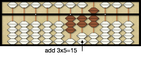 Now that we have multiplied each multiplicand digit with the first multiplier digit we move to the second multiplier digit the 3 of 63. Since we moved to the next multiplier digit we also move our starting rod one rod to the right. So for the second multiplier digit we enter the first product on rod 3 instead of rod 4. Please recognize that the reason for adjusting the starting rod for each multiplier digit is a simple mechanic used on the abacus to ensure we always maintain the correct place value for entering each product fact. Alternatively you could now think of the multiplier as a single digit number so our starting rod for the second multiplier digit will be 2 +1 = 3 (2 multiplicand digits and 1 multiplier digit). Next we add the product of the 5 in 52 by the 3 in 63, or 5×3=15 on the 3rd rod.