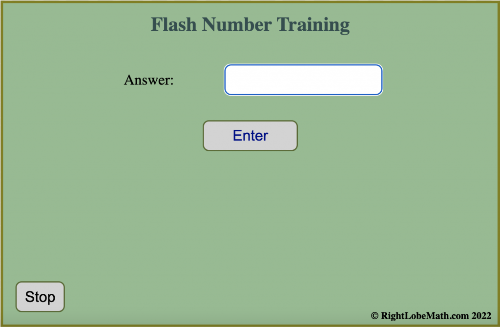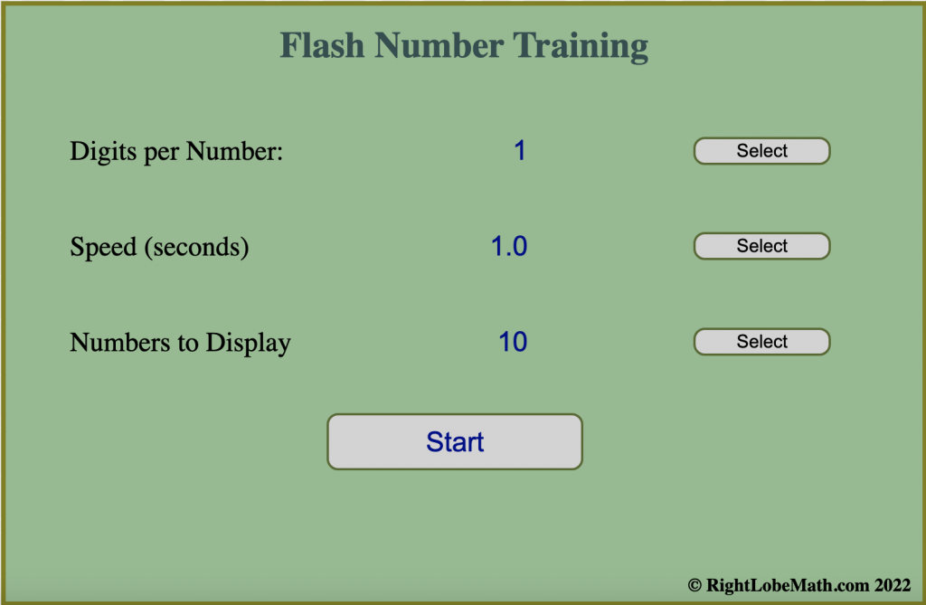 Flash anzan competitors will often use a tool like the one shown here for daily practice. They set how many digits they want in each number, how many numbers to show sequentially, and how fast to show them.